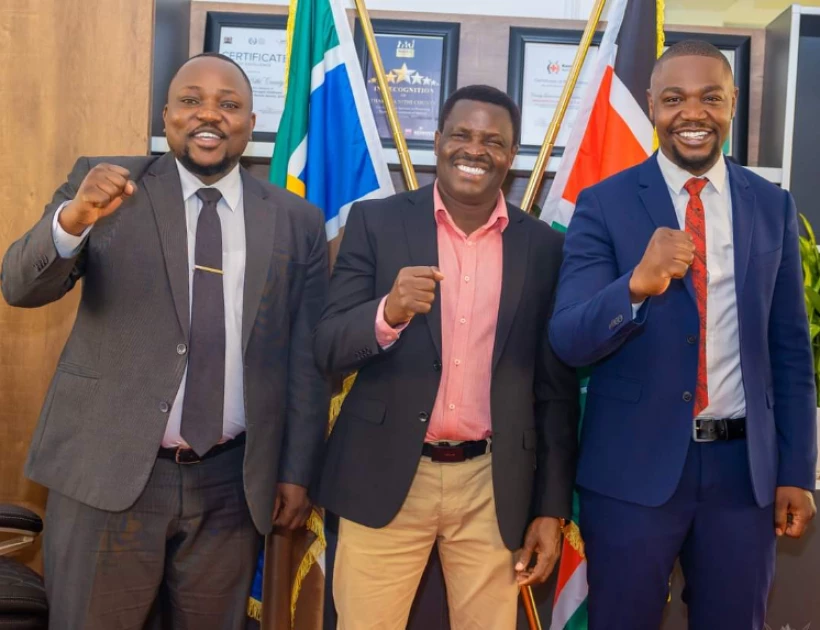 Tharaka Nithi Governor Muthomi Njuki (Centre) is flanked by KMPDU leaders, Deputy Secretary General Dr. Dennis Miskellah (Left) and Secretary General Dr. Davji Atellah (Right) after a past meeting. PHOTO | COURTESY