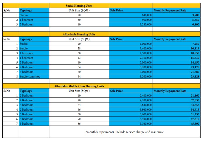 As detailed in an advert published on Tuesday, December 3, the housing projects consist of studio apartments, one one-bedroom to three-bedroom units.