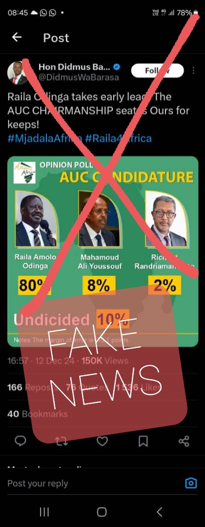 Amani Africa, an independent pan-African policy research organization, has called out Kimilili MP Didmus Barasa for sharing a fake opinion poll regarding the race for the next chairperson of the African Union Commission (AUC).