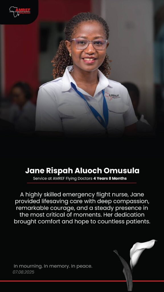 Also on board was flight nurse Jane Rispah Aluoch Omusula, who hailed from Butere, Kakamega County. In her four years and eight months of service with AMREF Flying Doctors, Omusula became known as a highly skilled emergency nurse who met every challenge with courage, compassion, and professionalism.