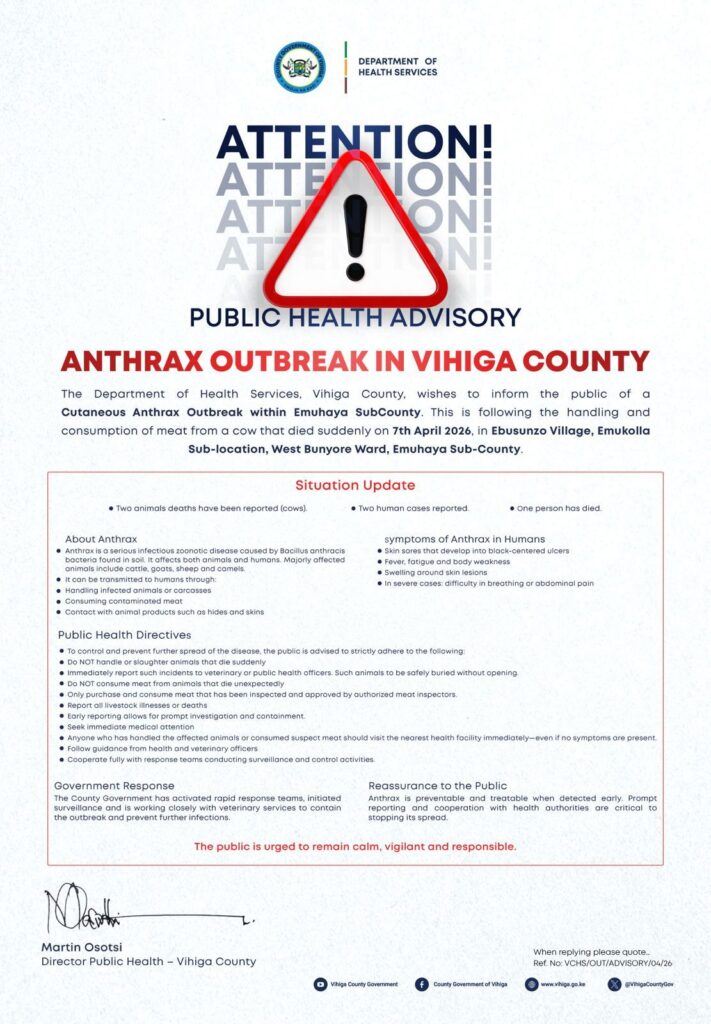 Health authorities in Vihiga County have issued a public health advisory following a confirmed outbreak of Anthrax in Emuhaya Sub-County.