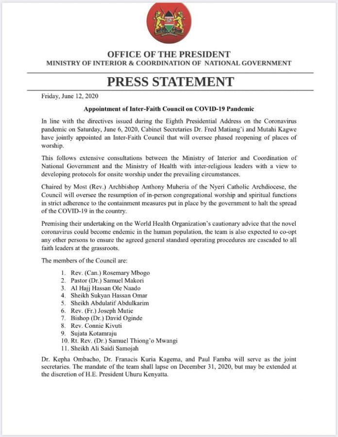 To maintain the solemn place of religion in our country, an Inter-Faith Council has been appointed to develop and operationalize protocols that will guide the gradual reopening of places of worship under the prevailing circumstances as directed by President Kenyatta last week.