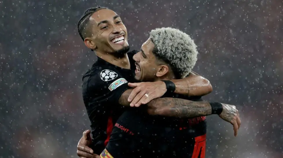 But Eric Garcia headed home a late equaliser and in the 96th minute, just after Szczesny had made a fine block from Angel di Maria and Benfica were denied a penalty, Raphinha broke away and slotted past Anatoliy Trubin to leave the home crowd stunned.