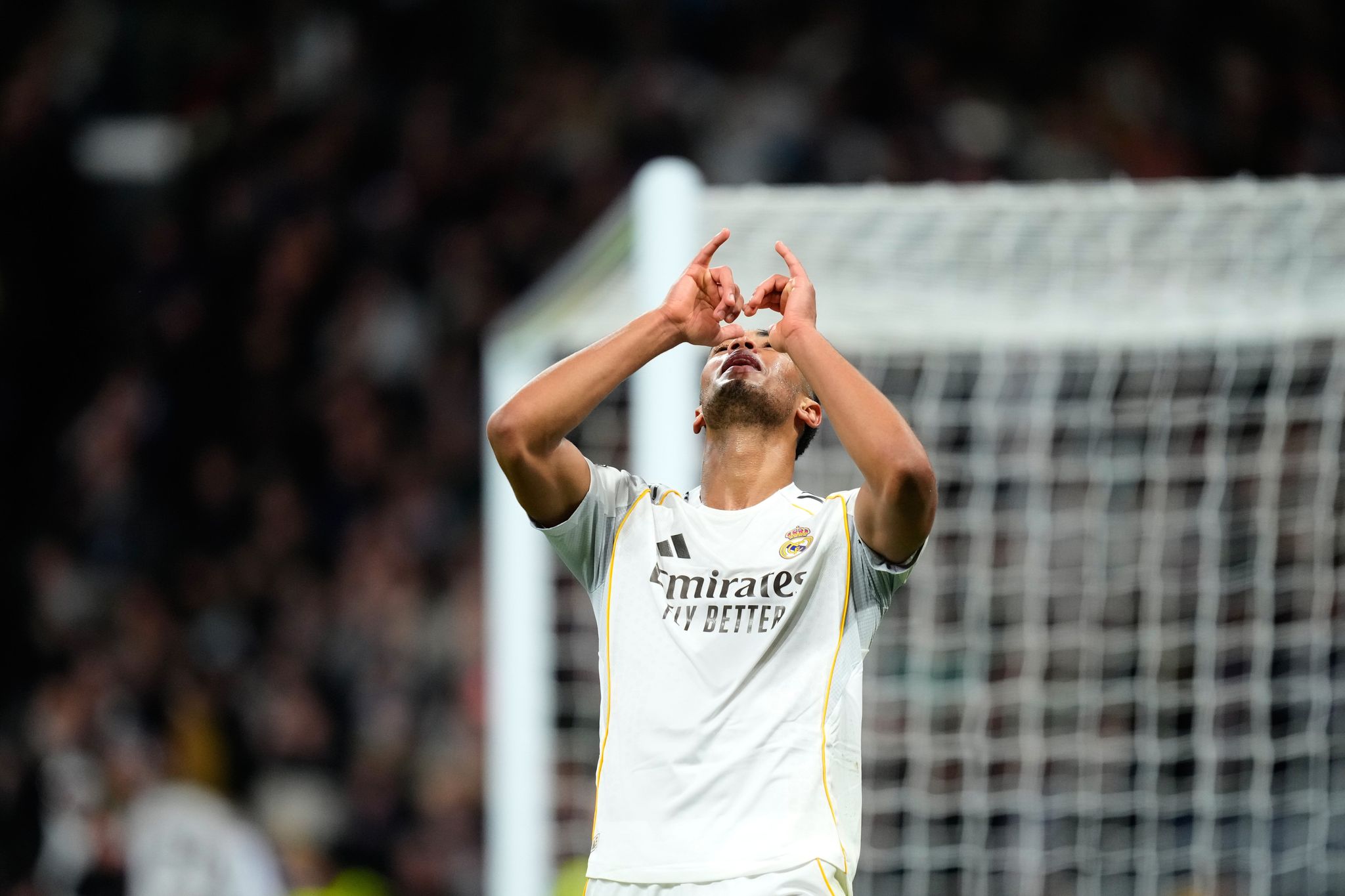 Real Madrid's Jude Bellingham celebrates his side's sixth goal during the Champions League opening phase soccer match between Real Madrid and Monaco in Madrid on Tuesday, Jan. 20, 2026. (AP Photo/Jose Breton)