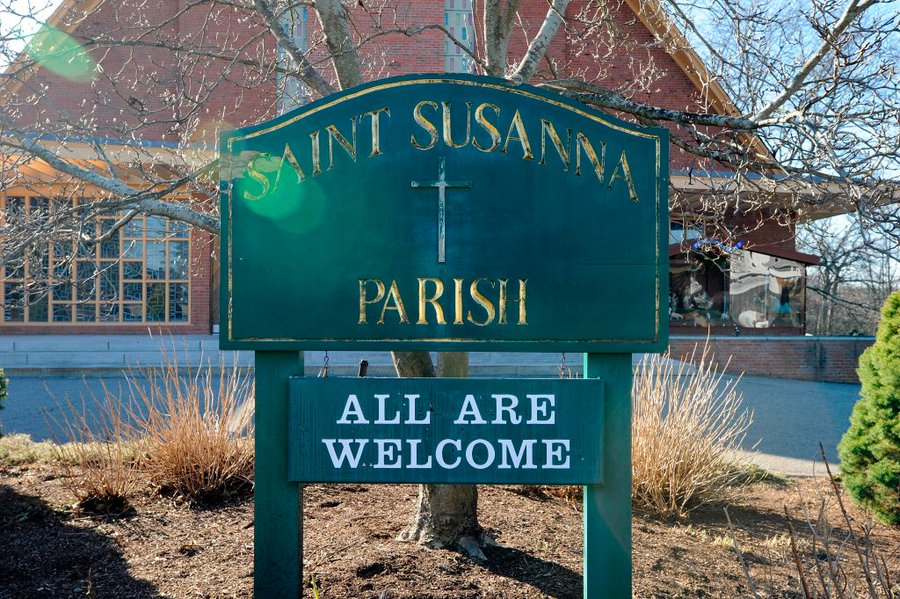 The provocative display at St Susanna parish in Dedham includes a placard bearing the telephone number of an immigrant-rights hotline.