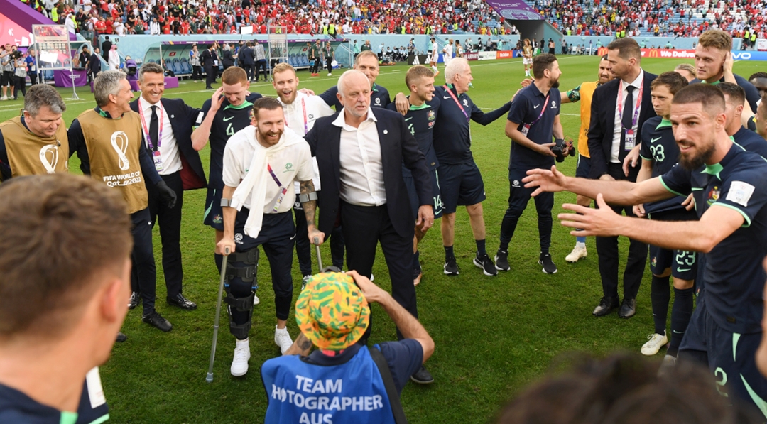 After Australia beat Tunisia in their second game on Saturday, coach Graham Arnold brought Boyle – wearing a knee brace and walking with crutches – into the team huddle in the middle of the pitch to celebrate the win.