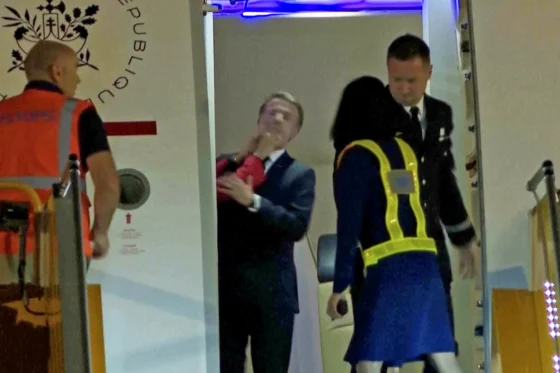 The clip, filmed at the open doorway of the presidential aircraft, shows Macron, 47, standing and smiling when a hand—believed to be Brigitte’s—lightly pushes his face.
