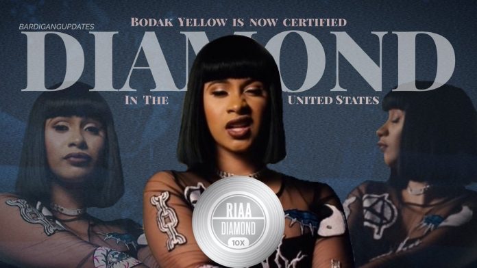 Cardi becomes the first female rapper to achieve a diamond single award that means Bodak Yellow has moved 10 million units, according to RIAA one equivalent song unit is equal to a single digital song sale.