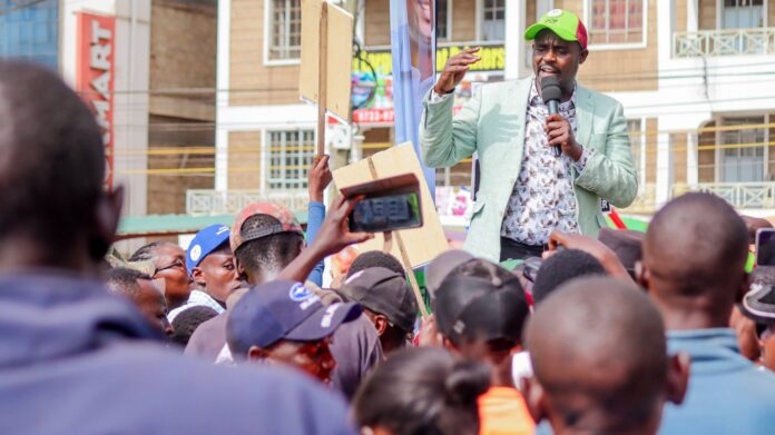 Cleophas Malala and Rigathi Gachagua speak to residents during a previous rally of their newly-found DCP Party.