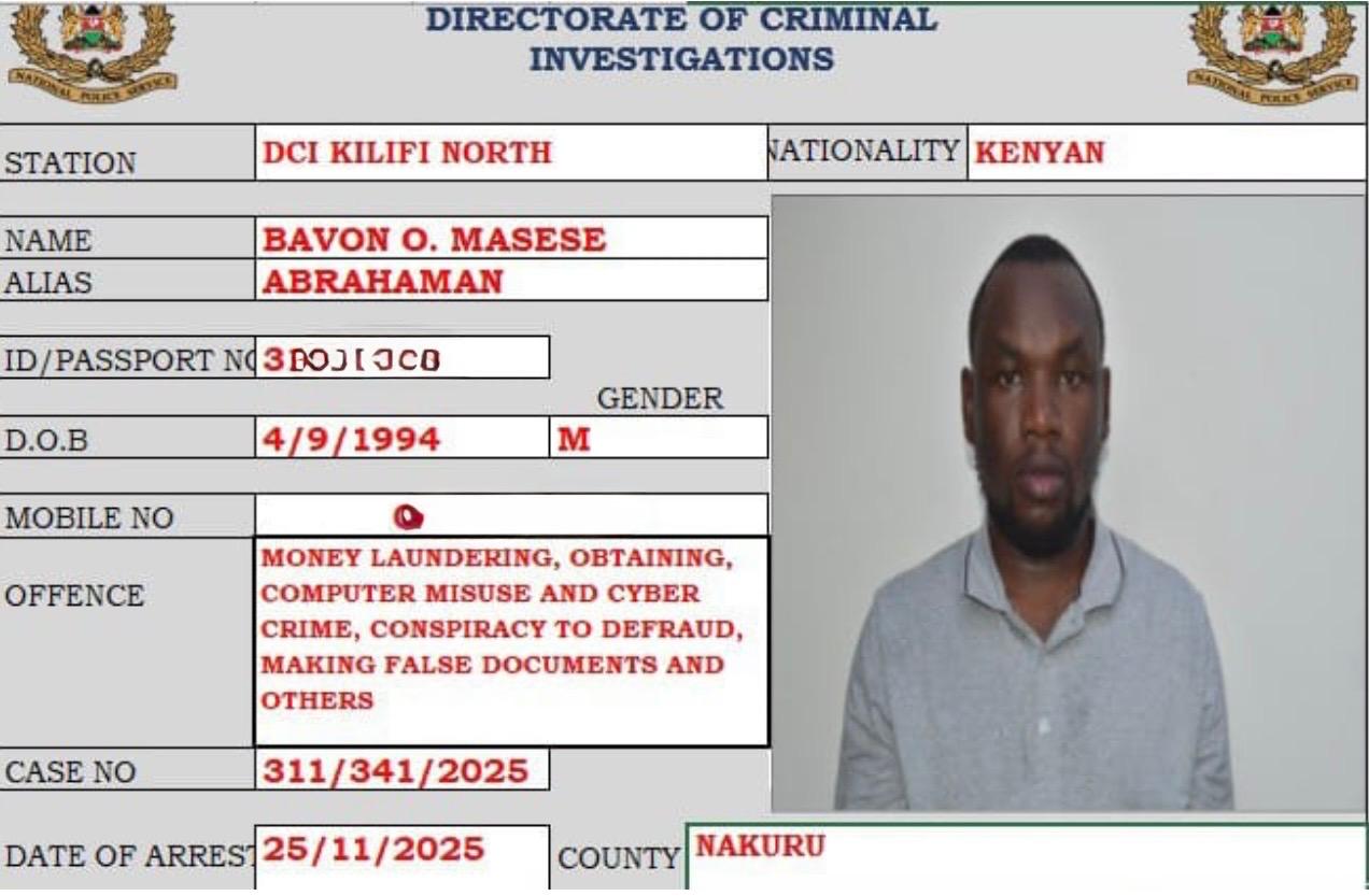 “Bavon Onyancha Masese’s (alias Abdirahaman Abdikarim, alias Jamie Damon) luck spectacularly ran out when investigators discovered he had swindled Ksh3.9 million from a Kilifi woman. This revelation immediately put him on the detectives’ radar, with the seasoned gumshoes trailing the perpetrator, effectively halting his scamming streak,” the statement added.