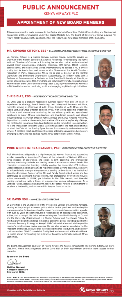 In a notice dated Thursday, March 5, 2026, the national carrier said the appointments were made in line with the Capital Markets (Securities) (Public Offers, Listing and Disclosures) Regulations, 2023, issued under the Capital Markets Act.