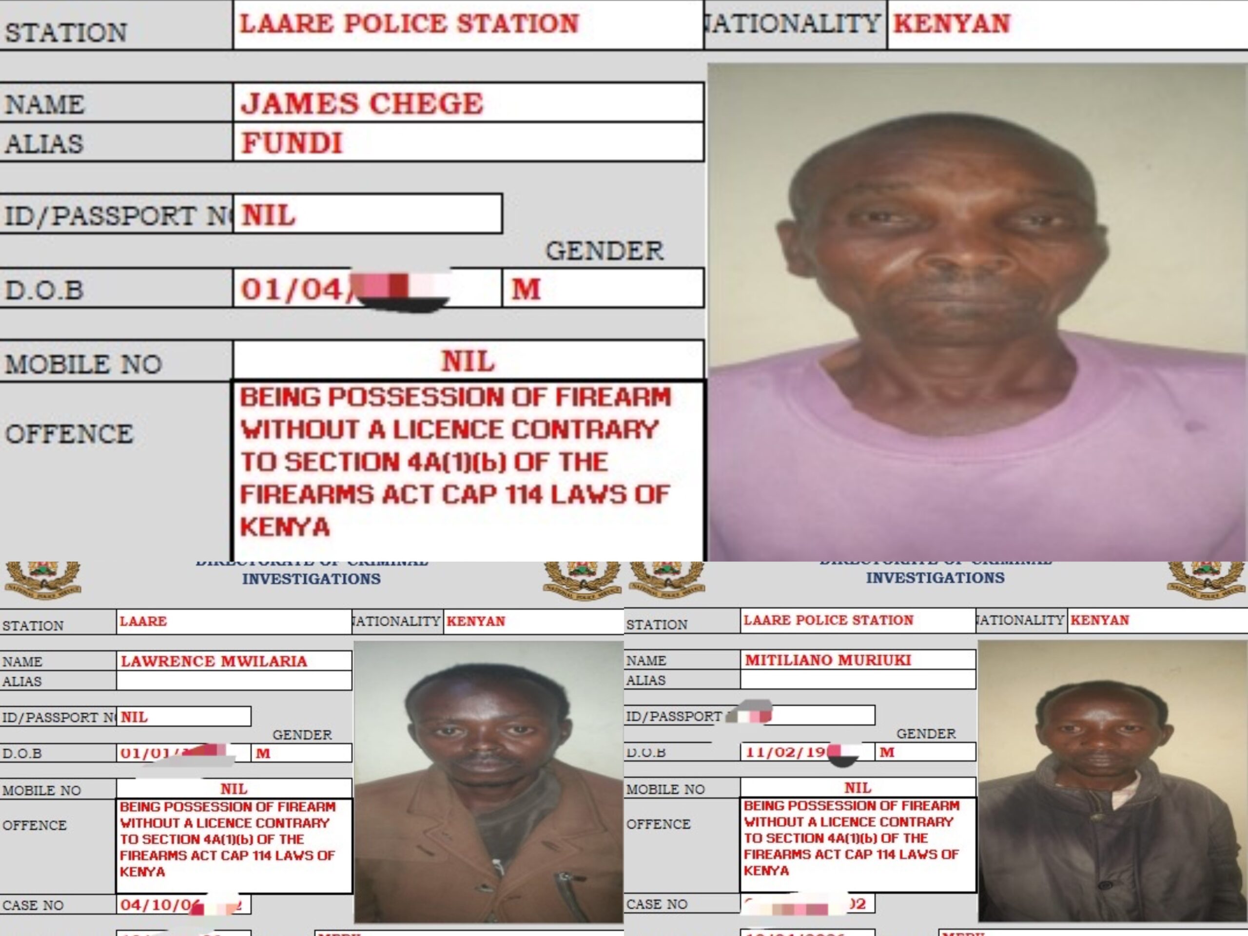 The suspects—James Chege, Mitiliano Muriuki and Lawrence Mwilaria—were apprehended in a coordinated raid conducted by officers from the Directorate of Criminal Investigations (DCI) Laare and Laare Police Station.