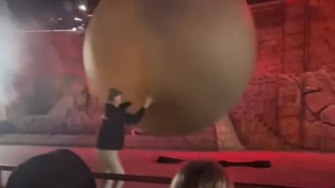 Footage shows the fake boulder rolling toward the seated audience before a staff member rushes into its path, stopping it from reaching the crowd. The worker was injured in the effort.