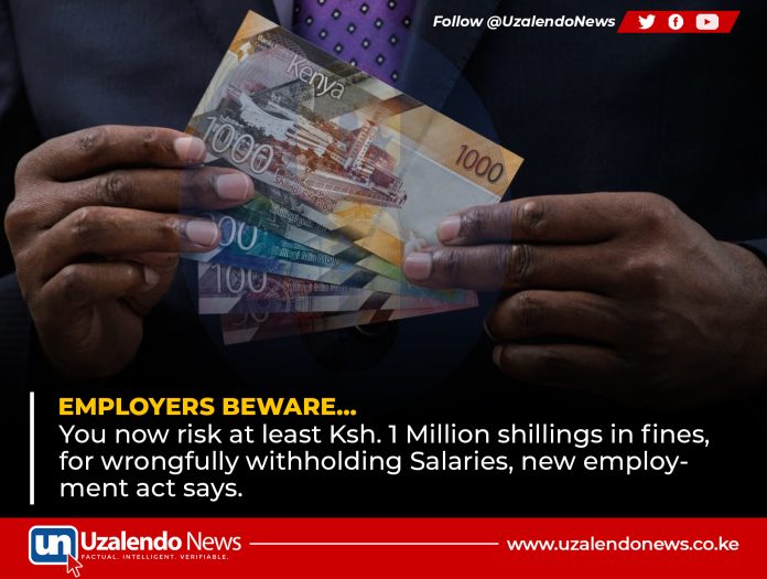 Employers now risk at least 1 Million shillings in fines, for wrongfully withholding or unlawful salary deduction, new act says.