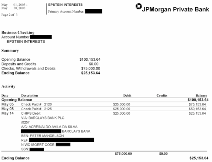 Between 2003 and 2004, Epstein appears to have sent three separate $25,000 payments referencing Lord Mandelson.