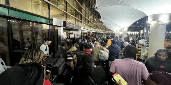 Travelers on-site reported that workers demanded payment to secure a chance to travel to their desired destinations, resulting in a large group of stranded passengers camping out in the airport’s parking lot.