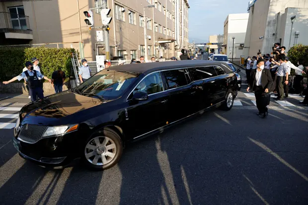 A car transporting the body of former Japanese prime minister Shinzo Abe arrives at his residence in Tokyo on Saturday, July 9.