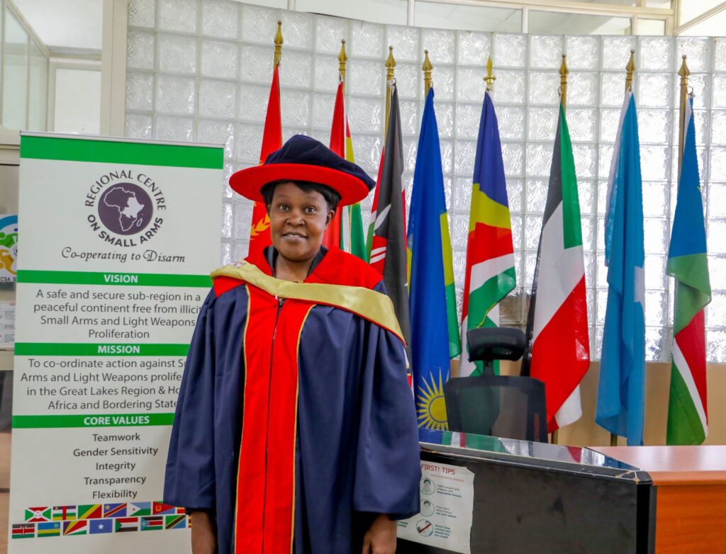 Today, her service extends beyond Kenya’s borders. She serves as a pioneer lady Director of Administration and Finance and Gender Focal Point at the Regional Centre on Small Arms and Light Weapons (RECSA), where she contributes to regional efforts aimed at controlling the proliferation of small arms and promoting peace and security across Africa and globally.
