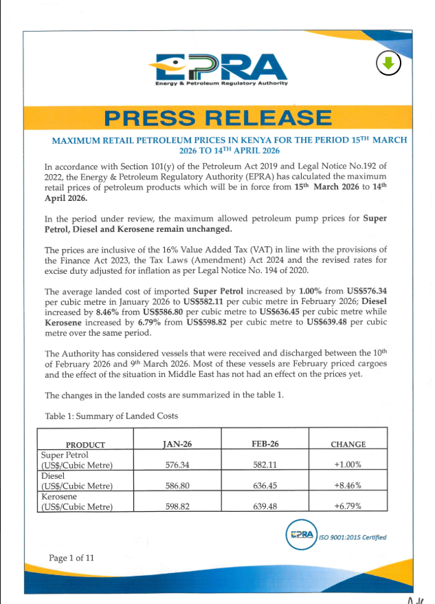 The Energy & Petroleum Regulatory Authority (EPRA) has announced that maximum retail prices for petroleum products in Kenya will remain unchanged for the period March 15 to April 14, 2026.