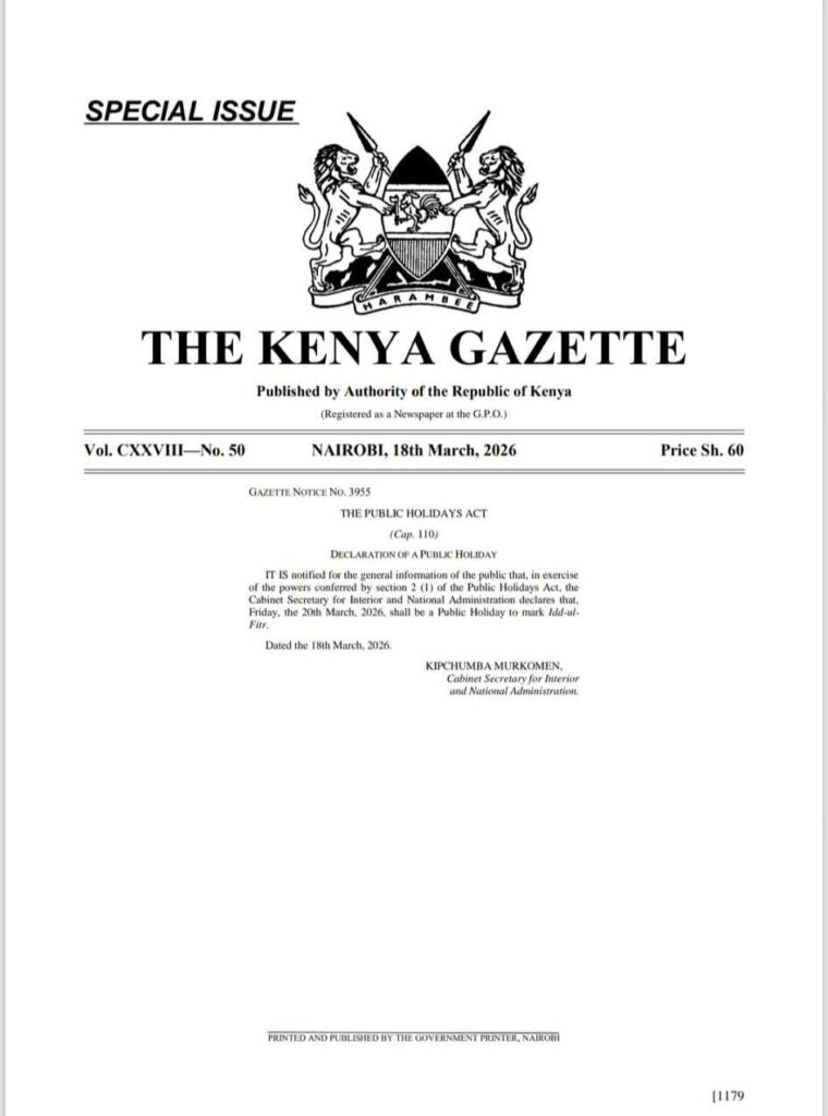 The government has officially declared Friday, March 20, 2026, a public holiday to mark Eid ul-Fitr, according to a special issue of the Kenya Gazette published on March 18, 2026.