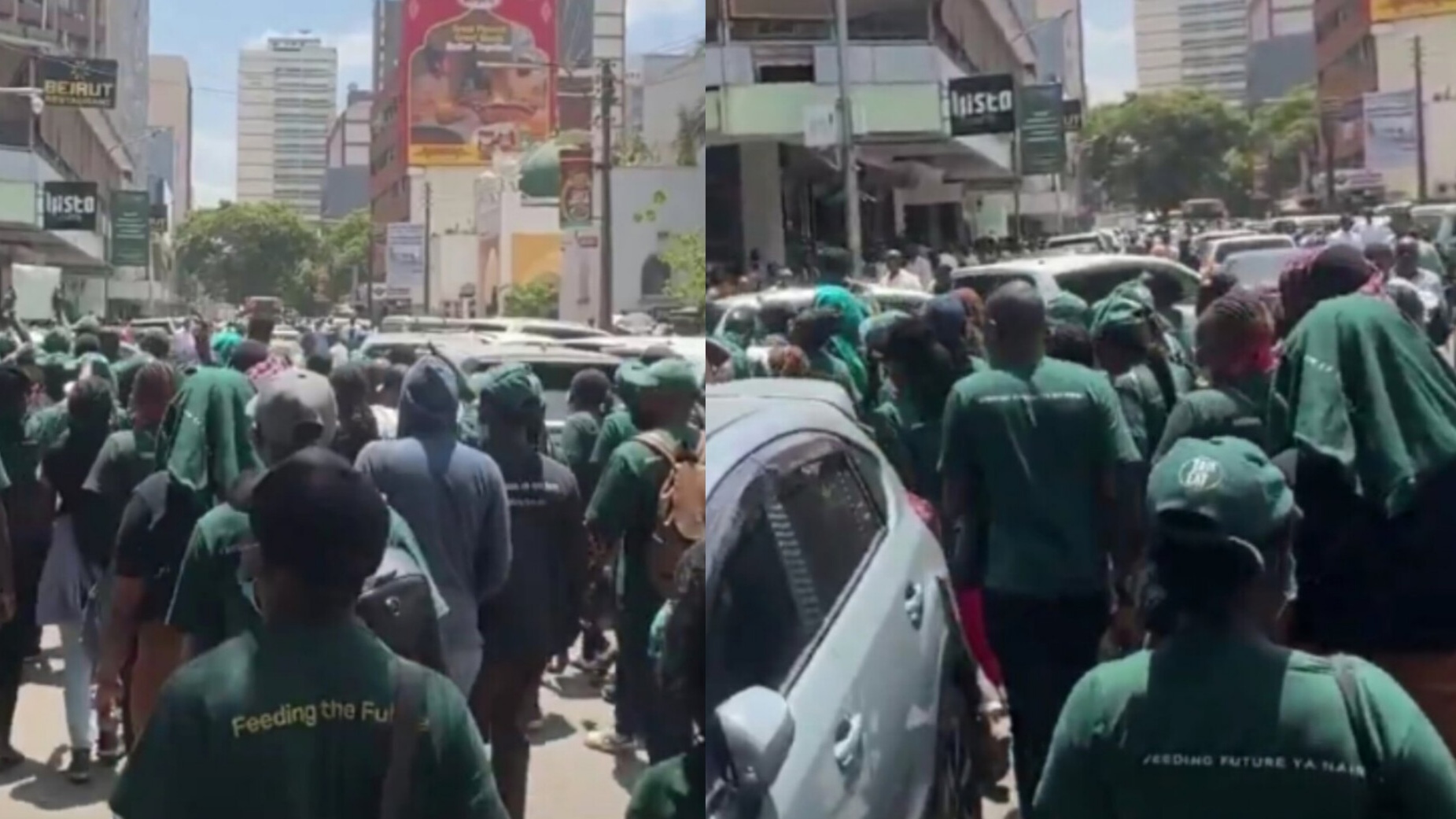 Staff members of Dishi na County, the school feeding program launched by Nairobi Governor Johnson Sakaja, staged a protest in the Central Business District (CBD) over unpaid salaries.