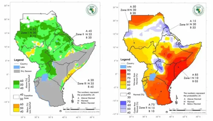 According to the latest seasonal outlook released at the 70th Greater Horn of Africa Climate Outlook Forum (GHACOF 70), the IGAD Climate Prediction and Applications Center (ICPAC) predicts an increased likelihood, up to 55%, of above-normal rainfall over key areas including central Sudan, eastern South Sudan, parts of southwestern and northern Ethiopia, western Kenya, and eastern Uganda.