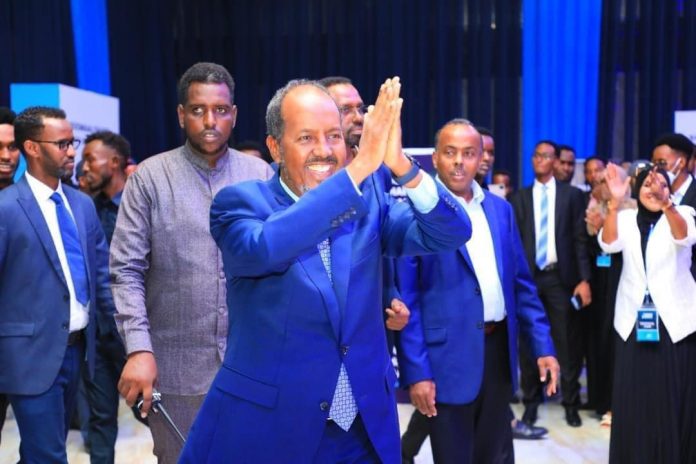 Former Somali leader Hassan Sheikh Mohamud won the presidency again in voting by parliamentarians on Sunday in an airport hangar protected by blast walls from Islamist insurgents whom he must now fight for a second time.