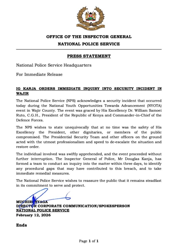In a statement issued by the National Police Service (NPS) on February 12, 2026, the incident took place during the National Youth Opportunities Towards Advancement (NYOTA) event. The Service stated that the President’s safety, as well as that of other dignitaries and members of the public, was not compromised.
