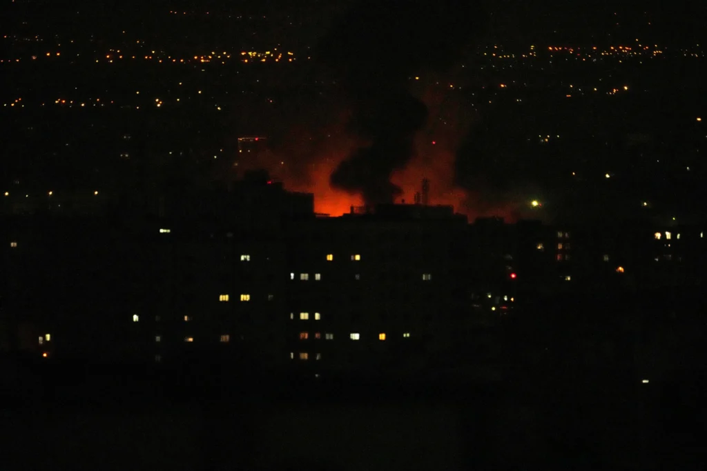 Press video captured pillars of fire lighting up the night sky above the Iranian capital in what appeared to be the first time a civilian industrial facility has been struck since the war began.