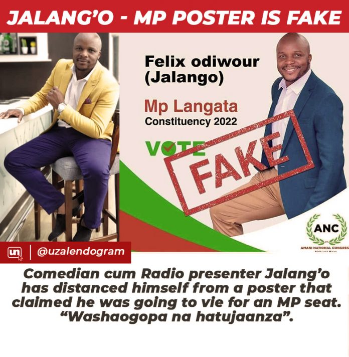 Comedian cum Radio presenter Jalang’o has responded to a poster that claimed he was going to vie for a parliamentary seat on an ANC party ticket come 2022. – By Stephanie MWANGI.