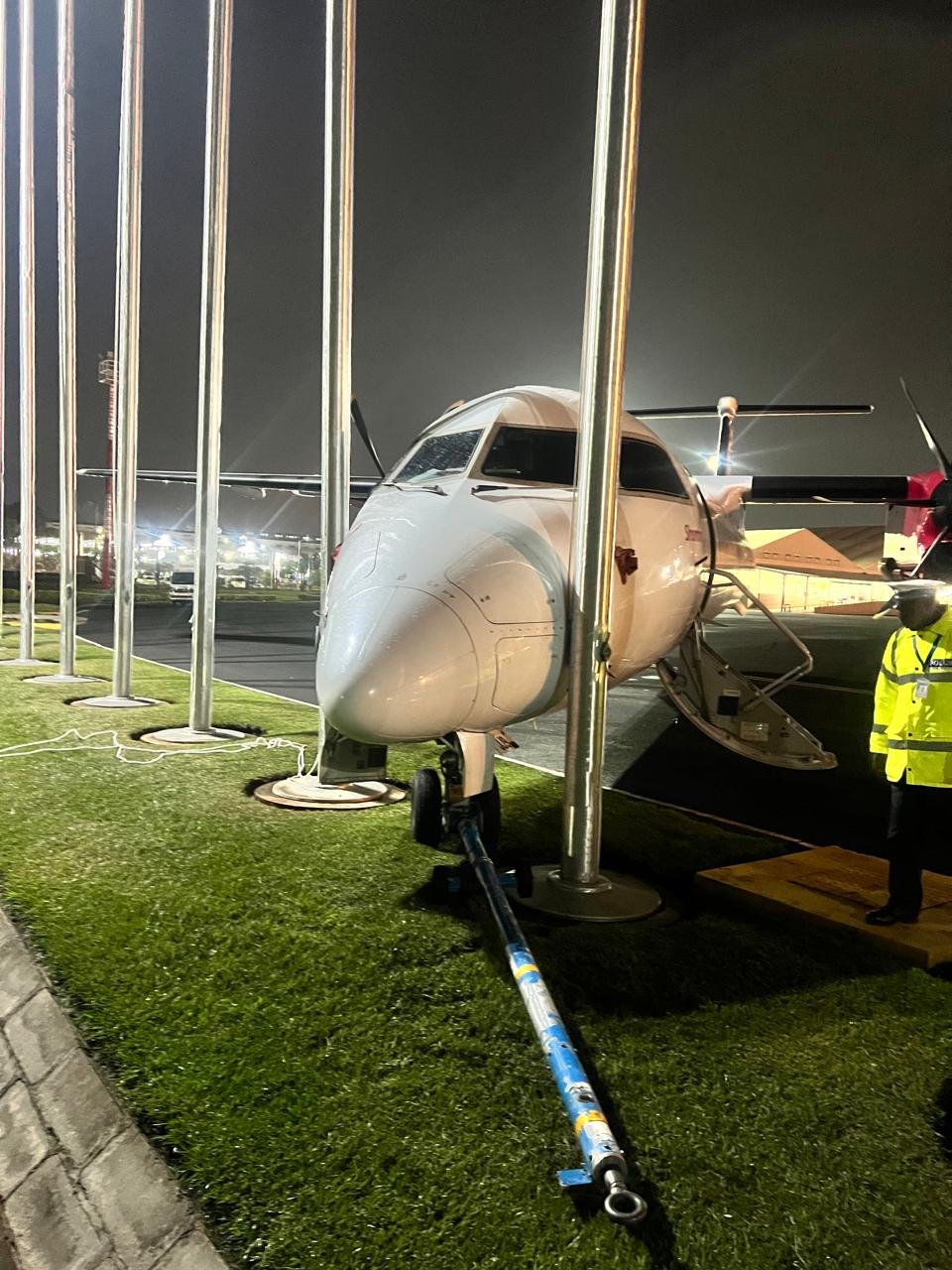 A Jambojet Q400 aircraft sustained significant damage after it rolled and crashed into flagpoles at the Restricted VIP state pavilion at Jomo Kenyatta International Airport (JKIA).