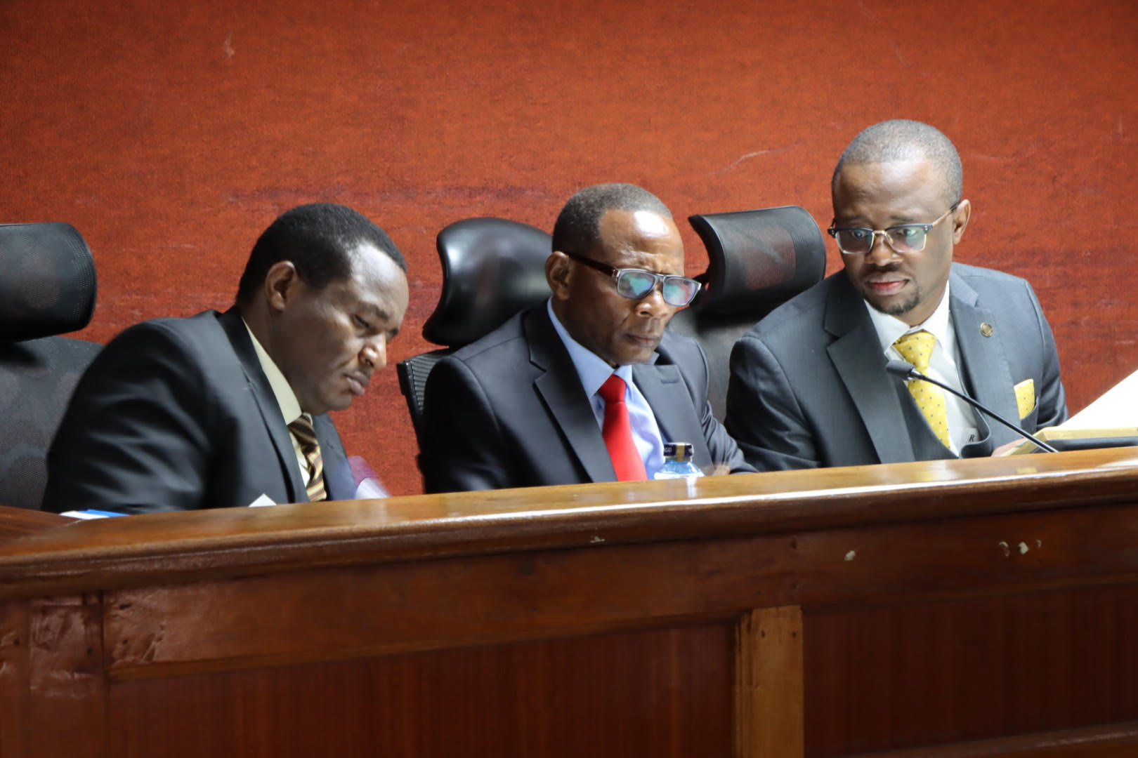 Justices Lawrence Mugambi, Charles Kariuki and Bahati Mwamuye during the ruling that dismissed a bid to disband the bench handling the JSC petition, at the Milimani Law Courts on November 14, 2025.