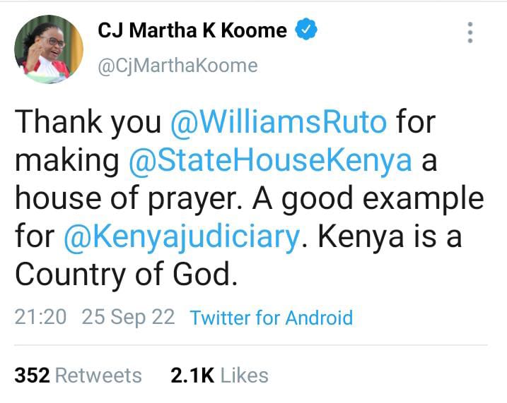 A tweet claiming that Chief Justice Martha Koome praised the prayers held at the State House on Sunday has been refuted.