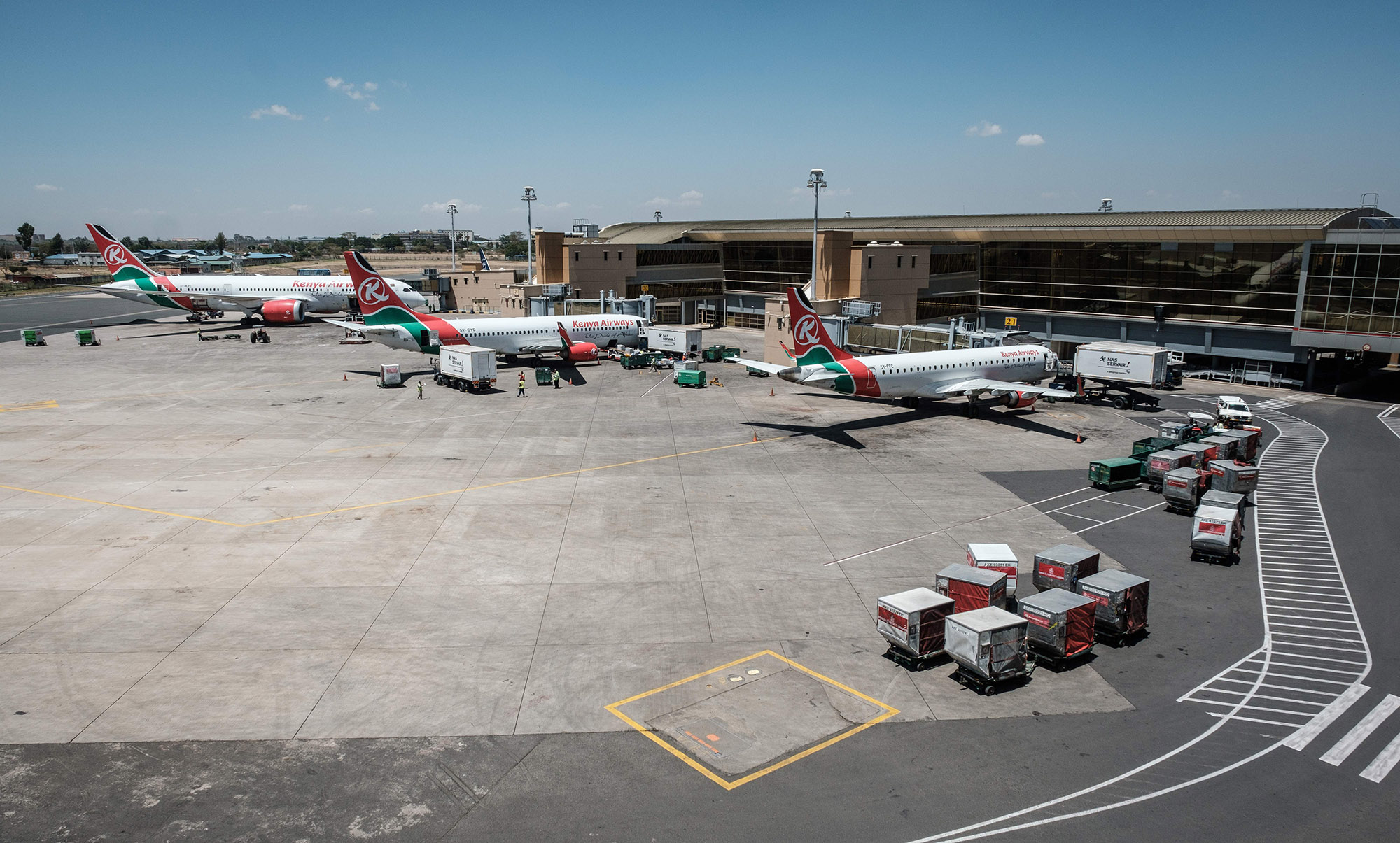 Aircrafts belonging to Kenya Airways are statione at the departure terminal during a strike by the airline workers at the Jomo Kenyatta International Airport in Nairobi on March 6, 2019. - Hundreds of travellers were stranded at Nairobi's international airport as riot police were deployed and teargas fired to disperse striking workers. With flights grounded since midnight, passengers were advised not to come to the Jomo Kenyatta International Airport -- East Africa's busiest according to the Kenya Airports Authority (KAA) -- until further notice. (Photo by Yasuyoshi CHIBA / AFP) (Photo credit should read YASUYOSHI CHIBA/AFP/Getty Images)