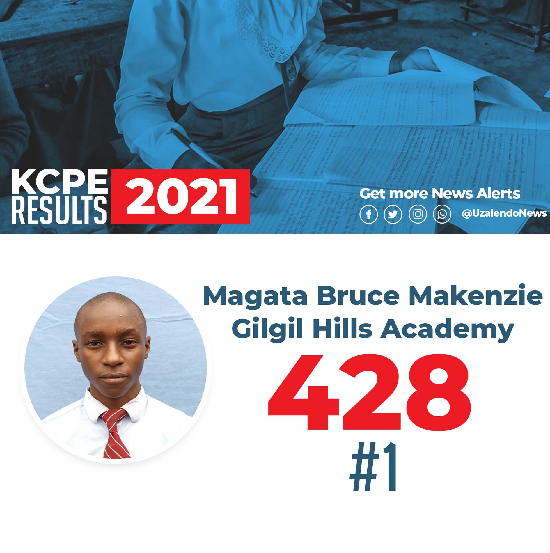 Magata Bruce Mackenzie came out on top in the recently completed Kenya Certificate of Primary Education (KCPE) examination for the year 2021.