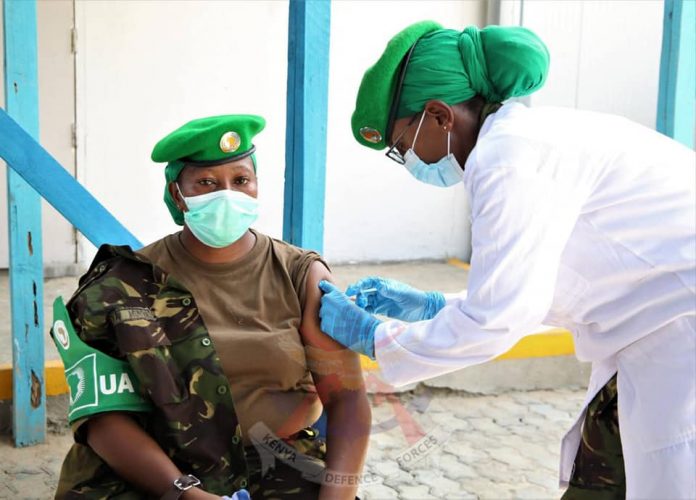 Director of Medical Services of the Kenya Defence Forces (KDF) Major General (Dr) George Ng’ang’a launched the Covid-19 vaccination exercise for troops deployed under the African Union Mission in Somalia (AMISOM) at Sector II Headquarters in Dhobley.