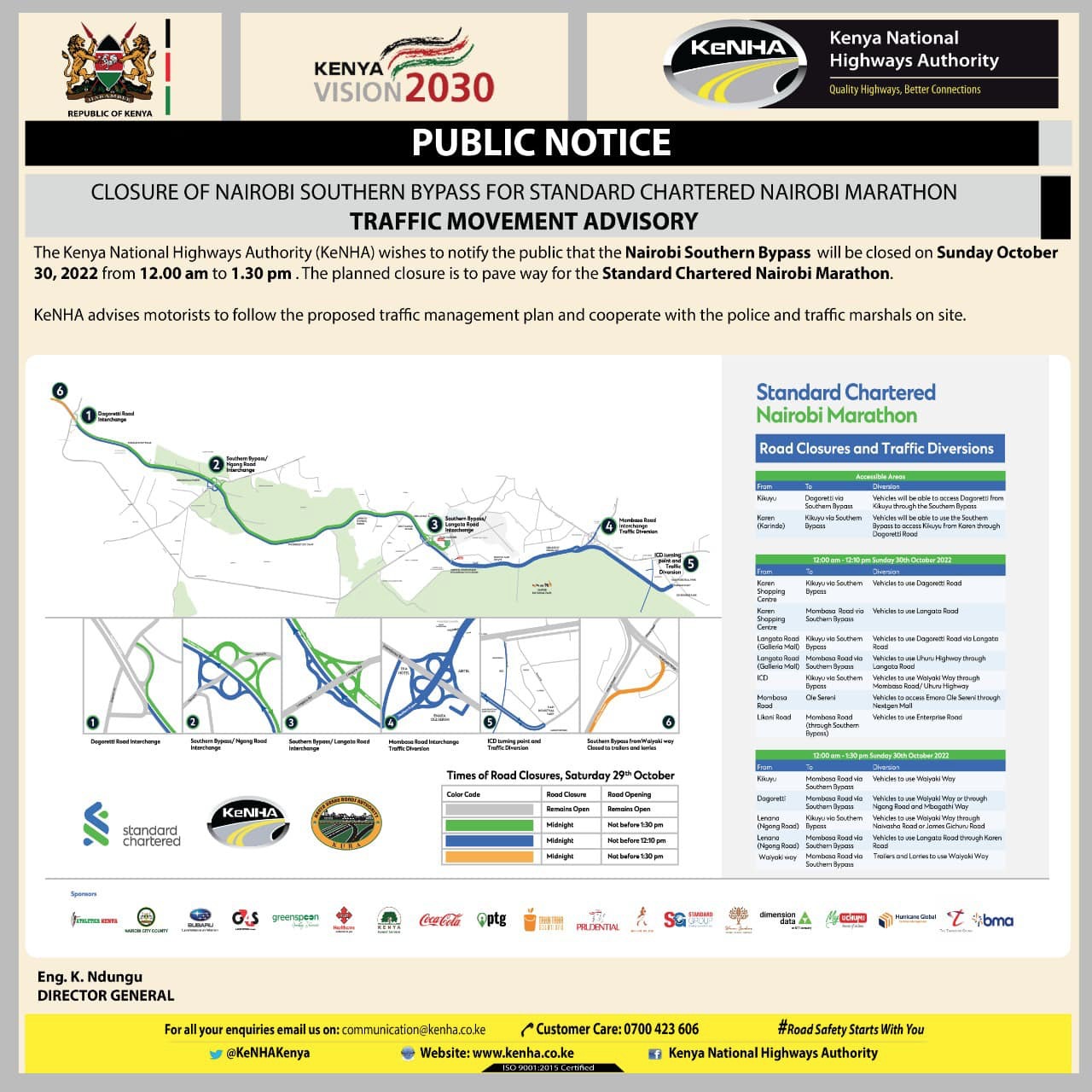 KeNHA explained that the closure is to pave way for the Standard Chartered Nairobi Marathon.