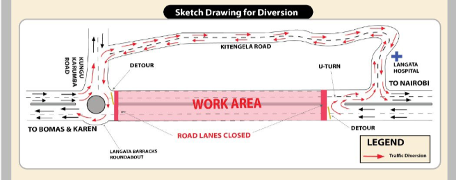 “Motorists heading towards Bomas and Karen are advised to take the U-turn towards Langata Hospital through Kitengela Road then to Kungu Karumba Road and back to Langata Road at Barracks Roundabout.”