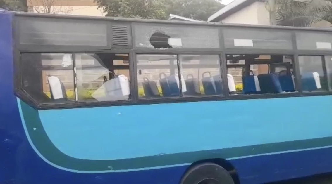 On Saturday morning, a Kenya Bus vehicle was vandalized on James Gichuru Road after the driver fatally hit a boda boda rider.