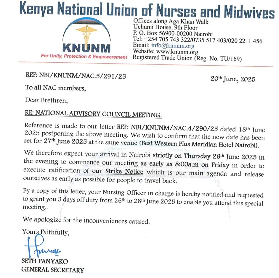 Union Secretary General Seth Panyako announced on Friday that the National Advisory Council will convene next Friday to formally ratify the strike notice, previously served to both the national and county governments. He urged union members to prepare for full participation and directed all Nursing Officers in charge to allow nurses three days off duty, from June 26 to June 28, to attend the special meeting.