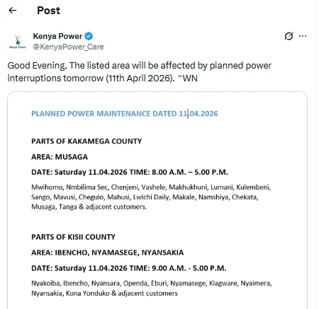 Residents in selected areas of Kakamega and Kisii counties should prepare for temporary electricity disruptions on Saturday, April 11, 2026, following a planned maintenance notice issued by the national electricity distributor.