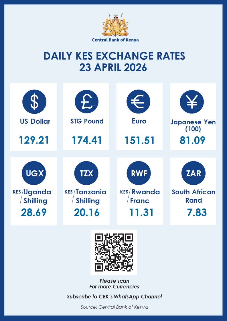 The Kenyan shilling remained relatively stable against major international and regional currencies, according to the latest exchange rates released by the Central Bank of Kenya (CBK) for April 23, 2026.