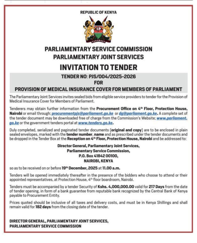 Tender No. PJS/004/2025-2026, floated this week by the Parliamentary Service Commission, will cost taxpayers several billion shillings over two years.