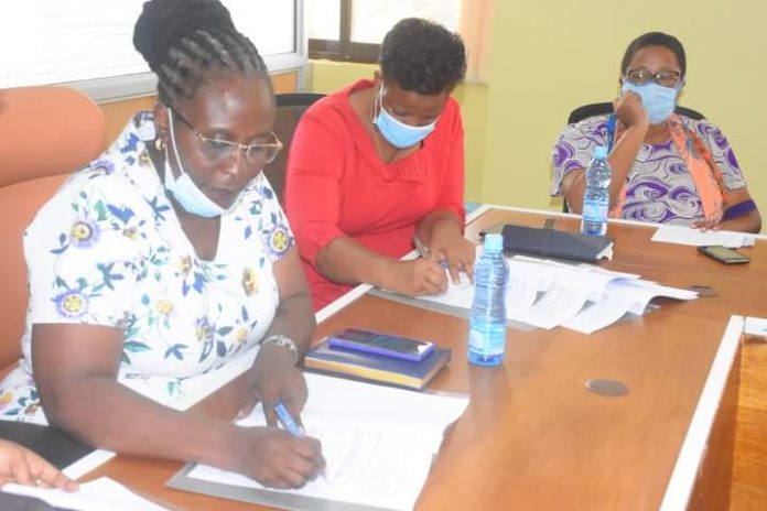 Kilifi Lands, housing and Urban Development Executive Member Maureen Mwangovya(Left) and Trade Chief officer Mary Mkare(in Red) signs an MoU with the Kilifi Jua Kali Association for the construction of a modern fire station in Kilifi town.