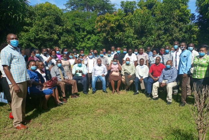 Kitui CECM for Education, ICT and Youth Development Mr Stephen Kyalo Maithya(Watutu), pose for a photo with Vocational Training Centre (VTC) Managers, after holding a meeting at Agricultural Training Centre (ATC) in Kitui town.