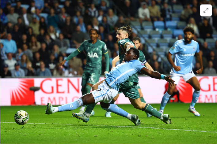 Brennan Johnson scored a stoppage-time winner as Tottenham Hotspur hit two late goals to scramble past second-tier Coventry City 2-1 and reach the last 16 of the League Cup on Wednesday.