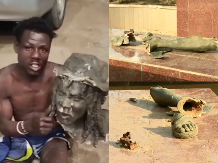 A video circulating on social media showed the man parading the statue’s detached head through the city’s central business district before being subdued and arrested by officers.