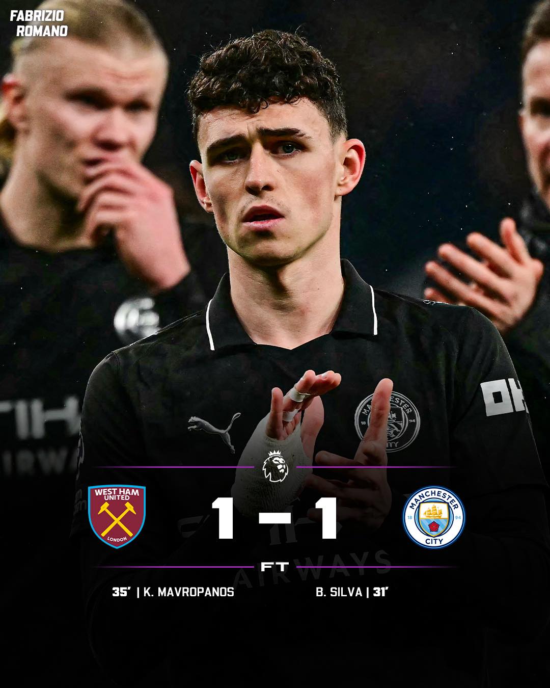 After Arsenal left it late to beat Everton 2-0, Bernardo Silva put City ahead in the 31st minute with a fortunate chip over goalkeeper Mads Hermansen, before Konstantinos Mavropanos headed home Jarrod Bowen’s corner four minutes later.