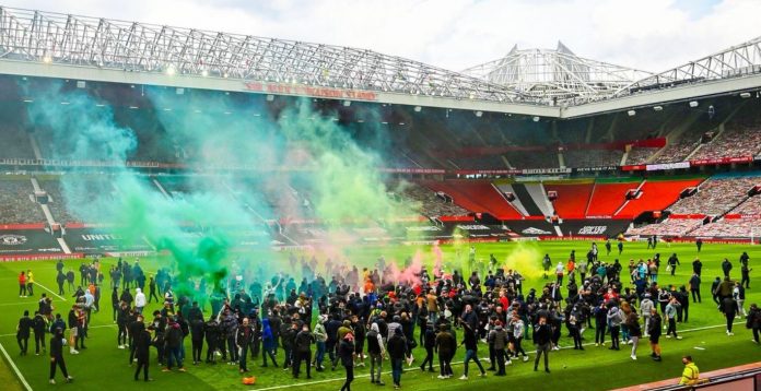 Manchester United’s home game against Liverpool was delayed after about 200 fans broke into their Old Trafford stadium to protest against the Glazer family’s ownership of the club.