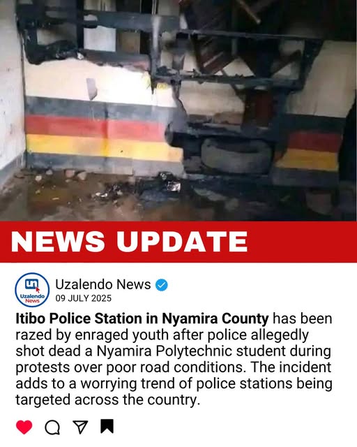 An enraged mob set ablaze the Itibo Police Station in Nyamira County on Tuesday after a student from Nyamira National Polytechnic was reportedly shot and killed by a police officer during a protest.